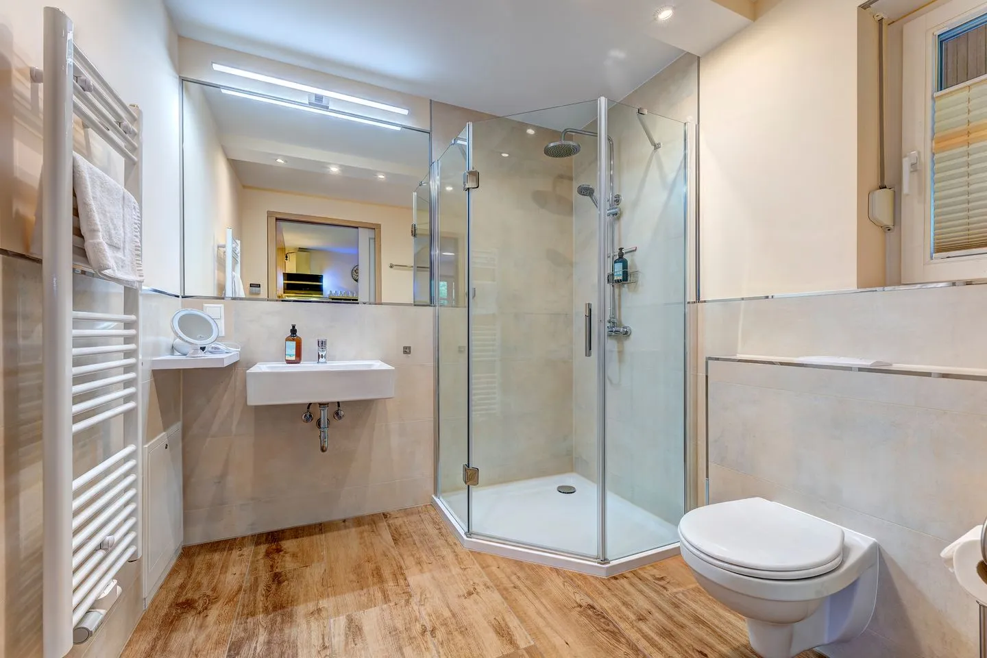 Das Badezimmer ist u.a. ausgestattet mit einer Dusche mit Flacher Duschwanne, Waschtisch, WC, Fön und Kosmetikspiegel.
