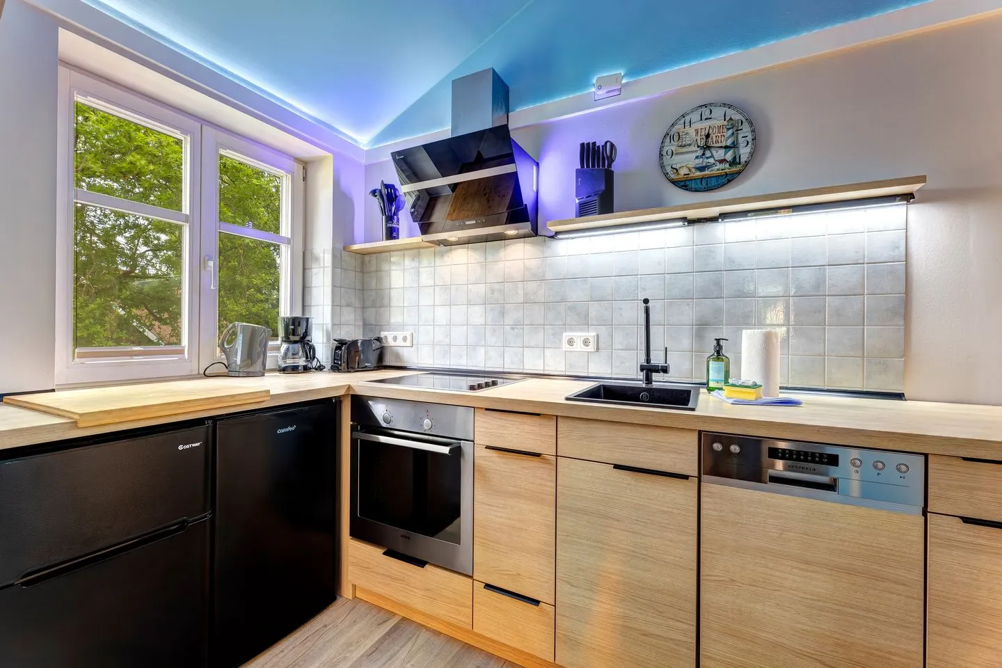 • Backofen, Wasserkocher, Cerankochfeld, Kaffeemaschine und Toaster